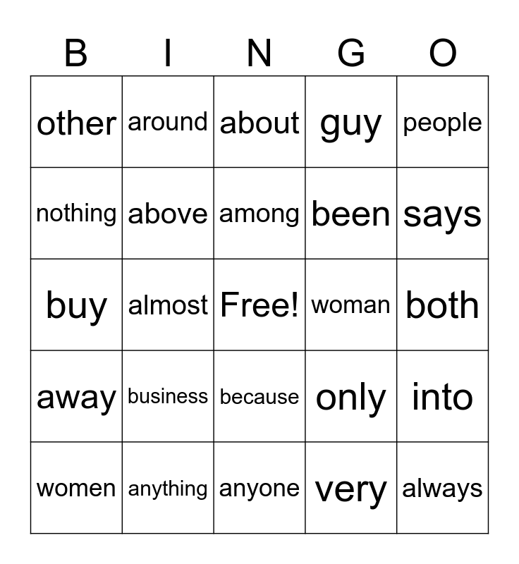 This bingo card has a free space and 28 words: into, two, been, very, nothing, about, around, away, woman, women, buy, guy, anything, anyone, says, busy, business, above, among, because, other, another, always, almost, both, only, people and beauty.