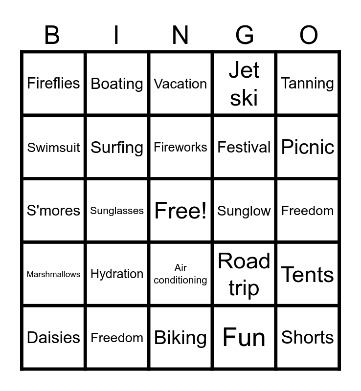 This bingo card has a free space and 75 words: Sunshine, Heat, Vacation, Beach, Pool, Ocean, Ice cream, Popsicle, Lemonade, Watermelon, Barbecue, Grilling, Fireworks, Swimsuit, Flip-flops, Sunglasses, Sunhat, Shorts, Tank top, Tanning, Bonfire, S'mores, Surfing, Boating, Jet ski, Snorkeling, Sandcastle, Seashell, Starfish, Breeze, Hammock, Camping, Hiking, Road trip, Picnic, Festival, Concert, Travel, Freedom, Fun, Adventure, Sprinkler, Slip 'n slide, Cold drinks, Frozen treats, Coconut, Daisies, Fireflies, Insects, Sunshine, Sunburn, Air conditioning, Lazy days, Outdoor games, Lawn chairs, Nature, Blue skies, Clear nights, Ice, Smoothie, Hydration, Lifeguard, Towel, Shells, Waves, Sunglow, Flip-flops, Kayaking, Paddleboarding, Tents, Marshmallows, Freedom, Skating, Biking and Stargazing.