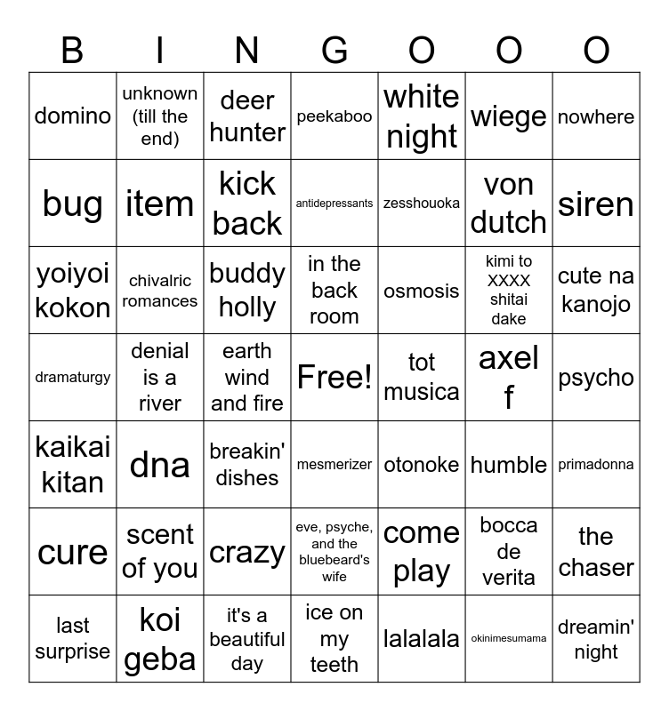 This bingo card has a free space and 53 words: it's a beautiful day, von dutch, 365, earth wind and fire, buddy holly, primadonna, unknown (till the end), black sorrow, wiege, cure, nowhere, otonoke, kimi to XXXX shitai dake, osmosis, bocca de verita, cute na kanojo, bug, siren, ice on my teeth, white night, zesshouoka, dreamin' night, item, domino, lalalala, dramaturgy, kaikai kitan, okinimesumama, psycho, kick back, castaway, mesmerizer, come play, the chaser, humble, dna, peekaboo, denial is a river, deer hunter, scent of you, crazy, eve, psyche, and the bluebeard's wife, yoiyoi kokon, it's going down now, last surprise, in the back room, axel f, breakin' dishes, antidepressants, chivalric romances, koi geba, tot musica and hollow hunger.