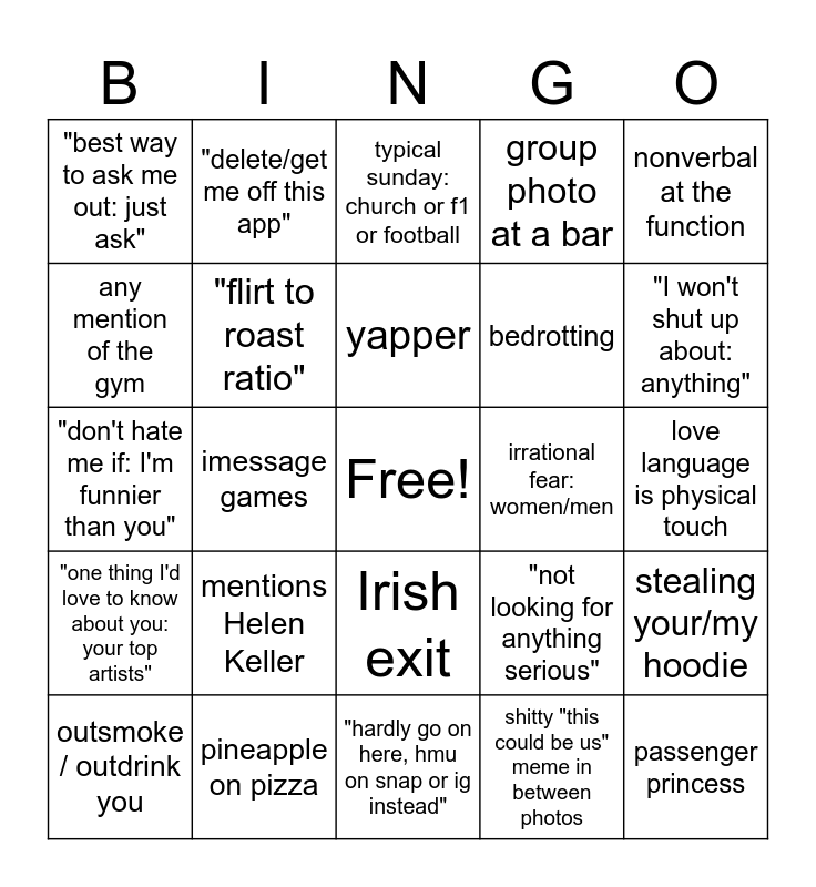 This bingo card has a free space and 24 words: mentions Helen Keller, pineapple on pizza, yapper, outsmoke / outdrink you, nonverbal at the function, "best way to ask me out: just ask", any mention of the gym, "delete/get me off this app", irrational fear: women/men, Irish exit, bedrotting, "don't hate me if: I'm funnier than you", "not looking for anything serious", stealing your/my hoodie, "flirt to roast ratio", shitty "this could be us" meme in between photos, love language is physical touch, typical sunday: church or f1 or football, "I won't shut up about: anything", imessage games, passenger princess, "one thing I'd love to know about you: your top artists", group photo at a bar and "hardly go on here, hmu on snap or ig instead".