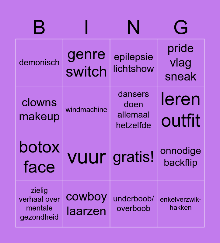 This bingo card has 16 words: cowboy laarzen, onnodige backflip, epilepsie lichtshow, demonisch, botox face, genre switch, gratis!, underboob/ overboob, clowns makeup, windmachine, zielig verhaal over mentale gezondheid, pride vlag sneak, vuur, leren outfit, dansers doen allemaal hetzelfde and enkelverzwik-hakken.