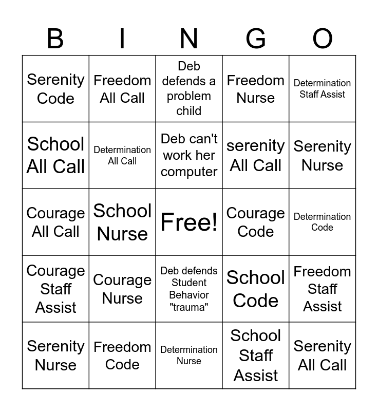 This bingo card has a free space and 24 words: Courage Nurse, Freedom Code, Deb can't work her computer, Serenity Nurse, Determination Staff Assist, Serenity Code, School All Call, Freedom All Call, Courage Code, Deb defends Student Behavior "trauma", serenity All Call, Courage All Call, School Code, Freedom Staff Assist, Determination All Call, School Staff Assist, Determination Code, Deb defends a problem child, Serenity Nurse, School Nurse, Serenity All Call, Courage Staff Assist, Freedom Nurse and Determination Nurse.