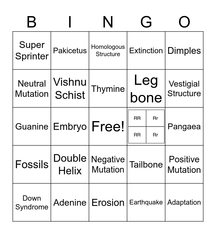 This bingo card has 1 images, a free space and 23 words: Double Helix, Adenine, Thymine, Down Syndrome, Dimples, Super Sprinter, Neutral Mutation, Pakicetus, Negative Mutation, Leg bone, Guanine, Tailbone, Positive Mutation, Vishnu Schist, Earthquake, Pangaea, Homologous Structure, Vestigial Structure, Embryo, Adaptation, Fossils, Extinction and Erosion.