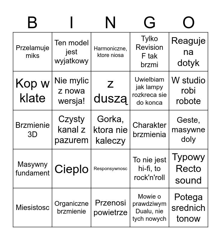This bingo card has a free space and 24 words: Cieplo, Organiczne brzmienie, z duszą, Miesistosc, Reaguje na dotyk, Przelamuje miks, Kop w klate, Ten model jest wyjatkowy, Charakter brzmienia, Responsywnosc, Uwielbiam jak lampy rozkreca sie do konca, Brzmienie 3D, To nie jest hi-fi, to rock'n'roll, Typowy Recto sound, Nie mylic z nowa wersja!, Mowie o prawdziwym Dualu, nie tych nowych, Geste, masywne doly, Harmoniczne, ktore niosa, W studio robi robote, Czysty kanal z pazurem, Potega srednich tonow, Masywny fundament, Tylko Revision F tak brzmi and Przenosi powietrze.