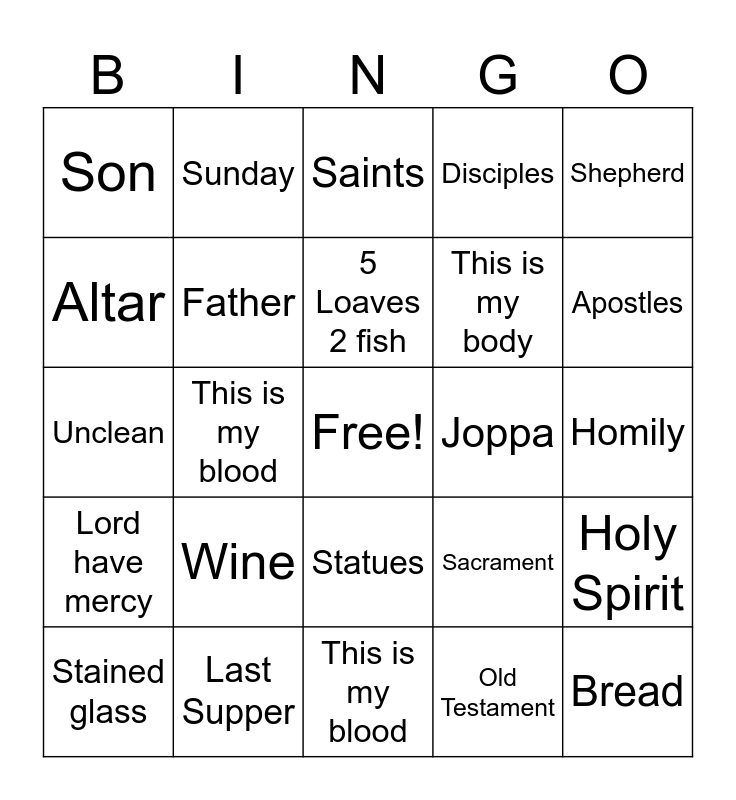 This bingo card has a free space and 109 words: Solider, Centurion, Joppa, God-fearing, Generous, Peter, Roman, Gave Generously, Poor, Prayers, Vision, Angel, Message, Christian, Simon, Tanner, Unclean, Sheet, Animals, Gentiles, Holy Spirit, Baptized, Gifts, Love, Lord Hear our Prayer, 5 Loaves 2 fish, Shepherd, Lamb of God, Liturgy of the Word, Liturgy of the Eucharist, Apostles, Disciples, Saints, Altar, Chalice, Bread, Wine, Eucharist, Last Supper, Passover, Cross, Sin, This is my body, This is my blood, Sacrament, AMEN, I am the vine, Altar, Stained glass, Statues, Confession, New Testament, Old Testament, Choir, Sign of Peace, Mass, Holy Communion, Reconciliation, Baptism, Father, Son, Holy Spirit, Child of God, Church, St. Joseph, Hail Mary, Our Father, Glory Be, Christian, Catholic, Family Meal, Sunday, Lord have mercy, Gospels, Bible, Jesus, Homily, Priest, Pray, Lord Hear our Prayer, 5 Loaves 2 fish, Shepherd, Lamb of God, Liturgy of the Word, Liturgy of the Eucharist, Apostles, Disciples, Saints, Altar, Chalice, Bread, Wine, Eucharist, Last Supper, Passover, Cross, Sin, This is my body, This is my blood, Sacrament, AMEN, I am the vine, Stained glass, Statues, Confession, New Testament, Old Testament, Choir and Sign of Peace.
