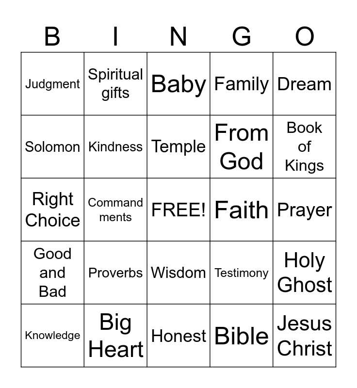 This bingo card has a free space and 24 words: Proverbs, Big Heart, Temple, Knowledge, Dream, Judgment, Solomon, Spiritual gifts, Faith, Wisdom, From God, Right Choice, Testimony, Holy Ghost, Kindness, Bible, Prayer, Baby, Book of Kings, Command ments, Jesus Christ, Good and Bad, Family and Honest.