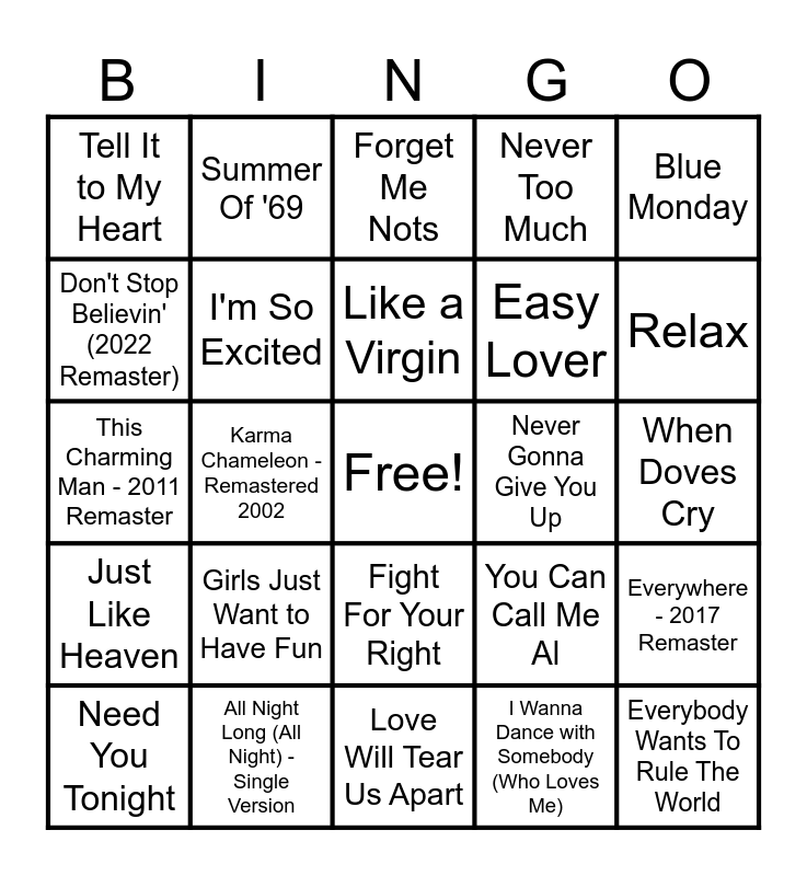This bingo card has a free space and 53 words: Take on Me, Everybody Wants To Rule The World, Tainted Love, I Wanna Dance with Somebody (Who Loves Me), Girls Just Want to Have Fun, You Make My Dreams (Come True), Summer Of '69, Heaven Is A Place On Earth, Don't Stop Believin' (2022 Remaster), Don't You (Forget About Me), I'm So Excited, You Give Love A Bad Name, Everywhere - 2017 Remaster, You Can Call Me Al, Just Can't Get Enough, Need You Tonight, Like a Virgin, Never Gonna Give You Up, Our House, Blue Monday, Karma Chameleon - Remastered 2002, Holding Out for a Hero - From Footloose Soundtrack, Easy Lover, Tell It to My Heart, Don't You Want Me, All Night Long (All Night) - Single Version, White Wedding, Walk This Way (feat. Aerosmith), Ain't Nobody, Relax, Gold, Rio - 2009 Remaster, Thriller - 2003 Edit, Candy, Get Down On It - Single Version, A Little Respect, Never Too Much, Love Will Tear Us Apart, Forget Me Nots, He's the Greatest Dancer - 1995 Remaster, Pull Up To The Bumper, Sexual Healing, When Doves Cry, Edge of Seventeen - 2016 Remaster, I Love Rock 'N Roll, Fight For Your Right, Running Up That Hill (A Deal With God), Call Me, This Charming Man - 2011 Remaster, Just Like Heaven, Heaven, Eternal Flame and Apache (Jump on It).