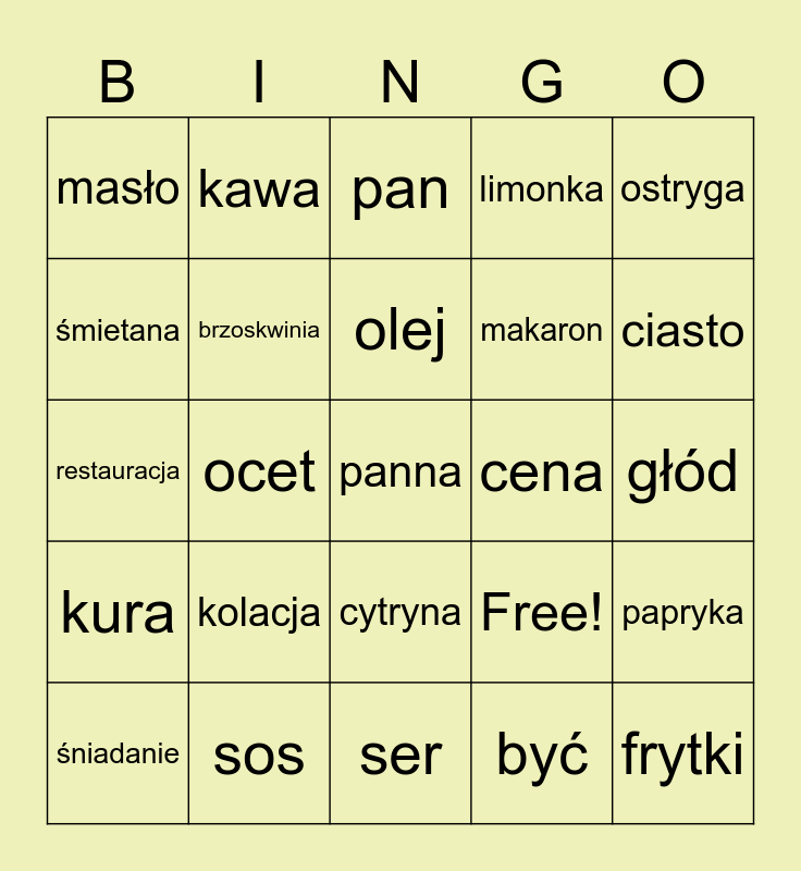 This bingo card has 25 words: kolacja, ser, olej, śniadanie, ostryga, masło, śmietana, kawa, cena, cytryna, makaron, restauracja, Free!, papryka, brzoskwinia, frytki, głód, pan, ciasto, ocet, panna, sos, kura, limonka and być.