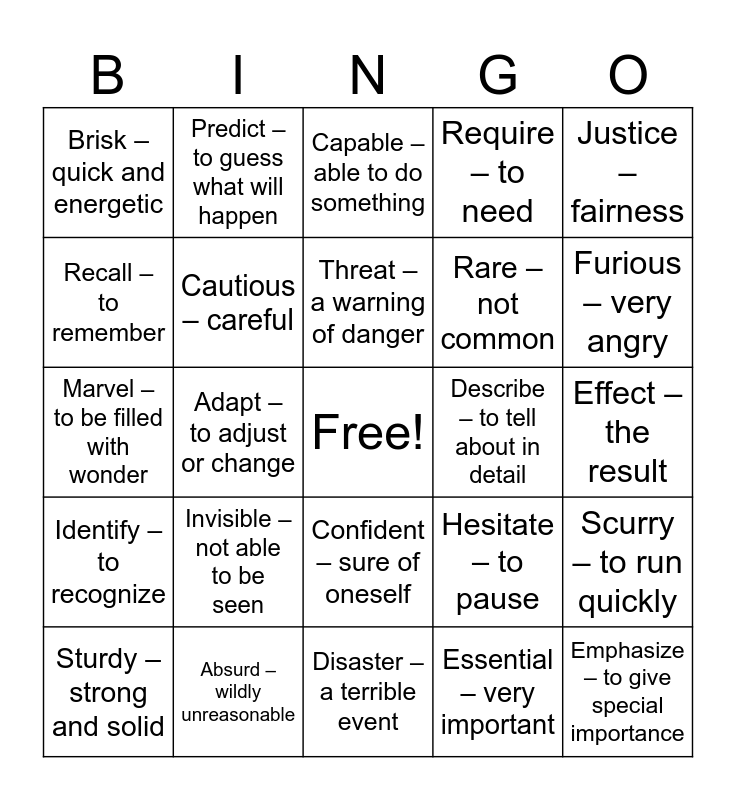 This bingo card has a free space and 30 words: Absurd – wildly unreasonable, Accumulate – to gather or collect, Adapt – to adjust or change, Anticipate – to expect, Brisk – quick and energetic, Capable – able to do something, Cautious – careful, Confident – sure of oneself, Describe – to tell about in detail, Disaster – a terrible event, Effect – the result, Emphasize – to give special importance, Essential – very important, Flexible – able to bend or change, Furious – very angry, Gigantic – extremely large, Hesitate – to pause, Identify – to recognize, Invisible – not able to be seen, Justice – fairness, Marvel – to be filled with wonder, Observe – to watch carefully, Predict – to guess what will happen, Rare – not common, Recall – to remember, Require – to need, Scurry – to run quickly, Sturdy – strong and solid, Threat – a warning of danger and Vivid – very clear and bright.