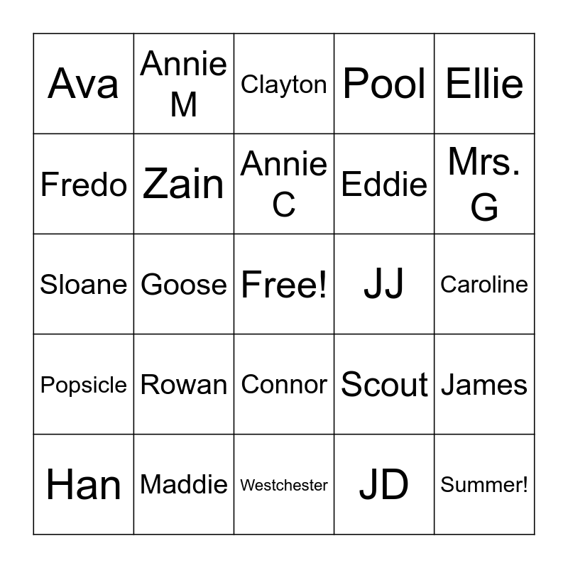 This bingo card has a free space and 24 words: Rowan, Maddie, Annie C, Han, Ellie, Ava, Fredo, Annie M, JJ, Connor, Eddie, Sloane, Scout, James, Zain, JD, Caroline, Clayton, Mrs. G, Goose, Summer!, Popsicle, Pool and Westchester.