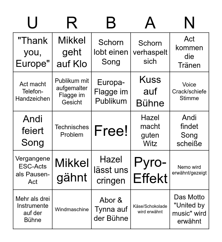 This bingo card has a free space and 24 words: Mikkel gähnt, Windmaschine, Europa-Flagge im Publikum, Mehr als drei Instrumente auf der Bühne, Act kommen die Tränen, "Thank you, Europe", Act macht Telefon-Handzeichen, Mikkel geht auf Klo, Hazel macht guten Witz, Hazel lässt uns cringen, Kuss auf Bühne, Andi feiert Song, Pyro-Effekt, Nemo wird erwähnt/gezeigt, Publikum mit aufgemalter Flagge im Gesicht, Käse/Schokolade wird erwähnt, Andi findet Song scheiße, Schorn lobt einen Song, Voice Crack/schiefe Stimme, Technisches Problem, Das Motto "United by music" wird erwähnt, Vergangene ESC-Acts als Pausen-Act, Schorn verhaspelt sich and Abor & Tynna auf der Bühne.