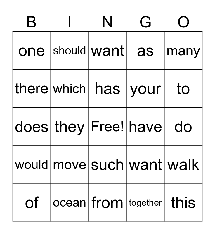This bingo card has a free space and 37 words: says, you, was, which, walk, move, has, the, many, said, they, as, this, do, there, would, here, want, such, have, one, to, of, from, put, together, should, come, were, once, give, ocean, does, where, want, your and could.