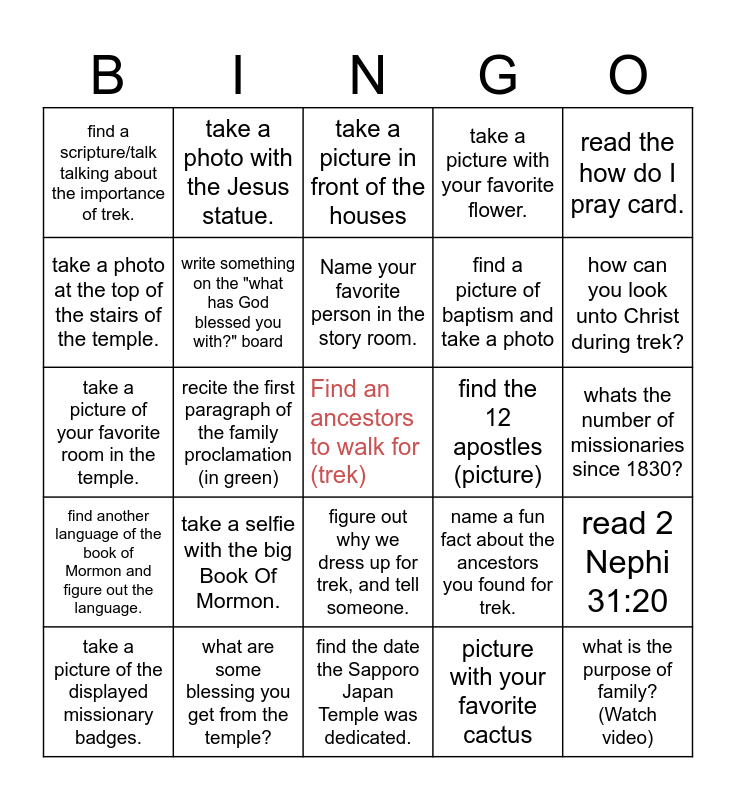 This bingo card has a free space and 24 words: take a selfie with the big Book Of Mormon., what are some blessing you get from the temple?, Name your favorite person in the story room., take a picture of the displayed missionary badges., read the how do I pray card., find a scripture/talk talking about the importance of trek., take a photo at the top of the stairs of the temple., take a photo with the Jesus statue., find the 12 apostles (picture), figure out why we dress up for trek, and tell someone., find a picture of baptism and take a photo, take a picture of your favorite room in the temple., name a fun fact about the ancestors you found for trek., read 2 Nephi 31:20, write something on the "what has God blessed you with?" board, picture with your favorite cactus, whats the number of missionaries since 1830?, take a picture in front of the houses, how can you look unto Christ during trek?, recite the first paragraph of the family proclamation (in green), what is the purpose of family? (Watch video), find another language of the book of Mormon and figure out the language., take a picture with your favorite flower. and find the date the Sapporo Japan Temple was dedicated..