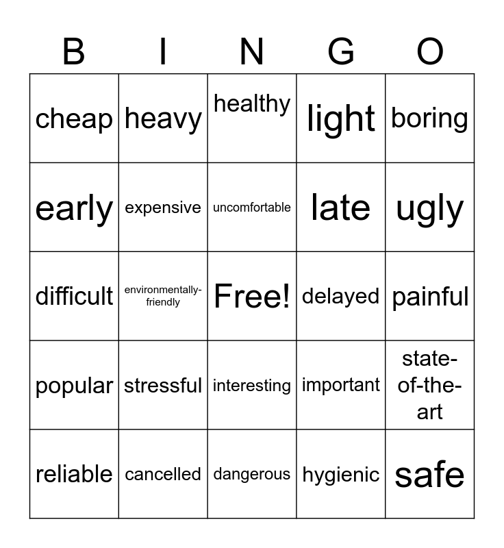 This bingo card has a free space and 29 words: reliable, convenient, environmentally-friendly, crowded, cheap, healthy, expensive, stressful, delayed, cancelled, painful, safe, dangerous, hygienic, ugly, famous, interesting, popular, boring, difficult, important, handsome, late, early, light, heavy, state-of-the-art, uncomfortable and old-fashioned.