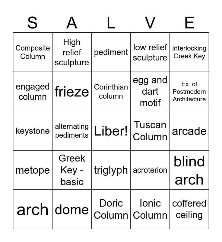 This bingo card has a free space and 30 words: dome, dentils, alternating pediments, vault, Composite Column, pediment, frieze, triglyph, Tuscan Column, Doric Column, arcade, coffered ceiling, Ionic Column, pilaster, Ex. of Postmodern Architecture, Ex. of Neoclassical Architecture, acroterion, metope, Greek Key - basic, Interlocking Greek Key, keystone, portico, High relief sculpture, egg and dart motif, engaged column, low relief sculpture, blind arch, arch, Corinthian column and volute.