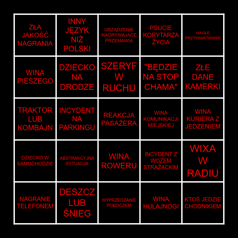This bingo card has 85 words: POLICJA, "RIKORD WIDEO", URZĄDZENIE NAGRYWAJĄCE PRZEMAWIA, "KUR*A MAĆ", DISCO POLO W RADIU, WINA BMW LUB AUDI, KTOŚ JEDZIE POD PRĄD, NAGRANIE NOCĄ, ŁÓDŹ NA NAGRANIU, RAP W RADIU, SZERYF W KORKU, ZWIERZĘ NA DRODZE, DZIECKO NA DRODZE, WINA KOMUNIKACJI MIEJSKIEJ, KOLIZJA, ZŁA JAKOŚĆ NAGRANIA, NAGRANIE TELEFONEM, WINA PIESZEGO, WINA MOTOCYKLA, NAGRANIE Z JEDNOŚLADU, WINA NAGRYWAJĄCEGO, "BĘDZIE NA STOP CHAMA", REAKCJA PASAŻERA, ROZMOWA KIEROWCY I PASAŻERA, INCYDENT NA PARKINGU, NAGRANIE Z DROGI SZYBKIEGO RUCHU, PODCAST W RADIU, KTOŚ SIĘ PRZEWRACA Z JEDNOŚLADU, ŚWIR W TIRZE, ŚRODKOWY PALEC, ABSTRAKCYJNA SYTUACJA, PRZESADZONA REAKCJA NAGRYWAJĄCEGO, SUPERSAMOCHÓD, TRAKTOR LUB KOMBAJN, KTOŚ JEDZIE CHODNIKIEM, WYPRZEDZANIE NA PASACH, WYPRZEDZANIE POBOCZEM, PODNIECENIE SYTUACJĄ, DZIECKO W SAMOCHODZIE, ZŁE DANE KAMERKI, NAGRANIE NA SIŁE, NIEPOTRZEBNA KOLIZJA, INSTANT KARMA, MIN. DWA INCYDENTY NA JEDNYM NAGRANIU, KTOŚ NIE UMIE W RONDO TURBINOWE, WINA VANA FIRMY KURIERSKIEJ, INCYDENT NA TORACH, KŁÓTNIA KIERUJĄCYCH, KULTURALNA WYMIANA ZDAŃ KIERUJĄCYCH, FILM BEZ DŹWIĘKU, INNY JĘZYK NIŻ POLSKI, SZERYF W RUCHU, KTOŚ JEDZIE NA CZERWONYM, KTOŚ WYMUSIŁ, DODATKOWY KONTEKST, PRAWIE KOLIZJA, DESZCZ LUB ŚNIEG, PSUCIE KORYTARZA ŻYCIA, WINA TAXI, WYPADEK, INCYDENT PRZY ZJEŹDZIE Z DROGI, REMONT DROGI, WINA BUSA LUB AUTOKARU, SIGMA, WARIAT W SUVIE, NAGŁE PRZYHAMOWANIE, STRAŻ MIEJSKA, WIXA W RADIU, INCYDENT Z PASSATEM, HULAJNOGA NA DRODZE, NAGRYWAJĄCY DZBAN, WINA POLICJI, BLISKO POTRĄCENIA, NAGRANIE Z TYLNEJ KAMERY, L (ELKA) NA NAGRANIU, WINA ROWERU, WINA HULAJNOGI, PRZEPROSINY ŚWIATŁAMI, ŁYSY LUB GRUBY PSYCHOL, WINA SKUTERA, WINA KURIERA Z JEDZENIEM, PLAKAT Z POLITYKIEM, INCYDENT Z KARETKĄ, INCYDENT Z WOZEM STRAŻACKIM and KTOŚ UDERZA SAMOCHÓD RĘKOMA.