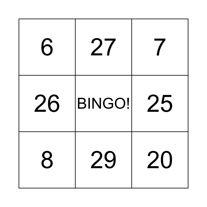 This bingo card has a free space and 29 words: 1, 2, 3, 4, 6, 7, 8, 9, 10, 11, 12, 13, 14, 15, 16, 17, 18, 19, 20, 21, 22, 23, 24, 25, 26, 27, 28, 29 and 30.