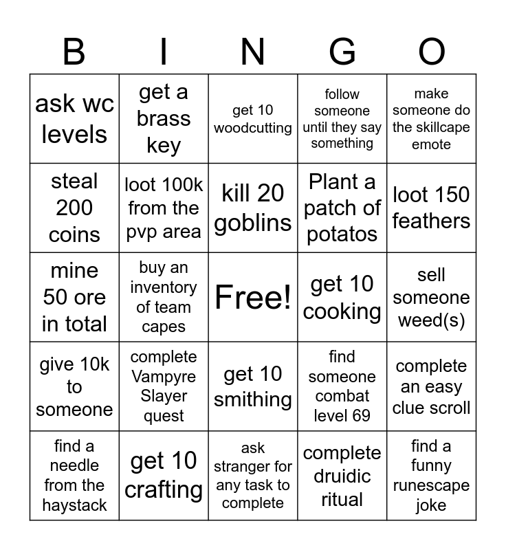 This bingo card has a free space and 24 words: complete Vampyre Slayer quest, get 10 crafting, kill 20 goblins, find a needle from the haystack, make someone do the skillcape emote, ask wc levels, steal 200 coins, get a brass key, get 10 cooking, get 10 smithing, Plant a patch of potatos, mine 50 ore in total, find someone combat level 69, complete an easy clue scroll, loot 100k from the pvp area, complete druidic ritual, sell someone weed(s), get 10 woodcutting, loot 150 feathers, buy an inventory of team capes, find a funny runescape joke, give 10k to someone, follow someone until they say something and ask stranger for any task to complete.