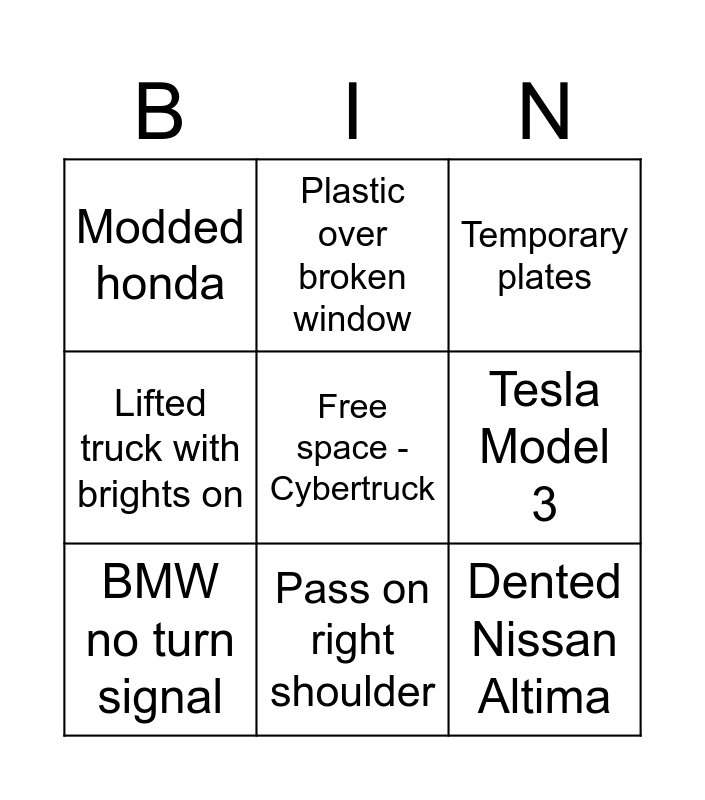 This bingo card has a free space and 8 words: Tesla Model 3, Temporary plates, Plastic over broken window, BMW no turn signal, Modded honda, Dented Nissan Altima, Lifted truck with brights on and Pass on right shoulder.