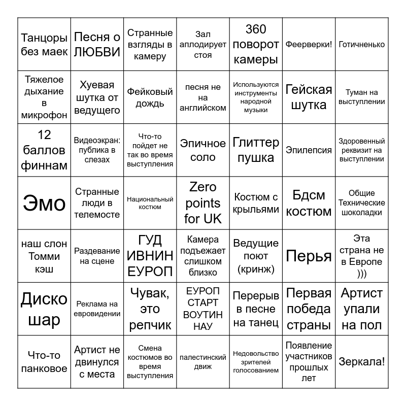 This bingo card has 49 words: Первая победа страны, Гейская шутка, Недовольство зрителей голосованием, Странные люди в телемосте, Что-то пойдет не так во время выступления, Общие Технические шоколадки, Песня о ЛЮБВИ, Смена костюмов во время выступления, Феерверки!, Камера подъежает слишком близко, Готичненько, Зал аплодирует стоя, Эпилепсия, Глиттер пушка, Реклама на евровидении, Бдсм костюм, Тяжелое дыхание в микрофон, Туман на выступлении, Артист упали на пол, 360 поворот камеры, Используются инструменты народной музыки, Национальный костюм, Танцоры без маек, Хуевая шутка от ведущего, Что-то панковое, Фейковый дождь, Здоровенный реквизит на выступлении, Артист не двинулся с места, Эпичное соло, Видеоэкран: публика в слезах, Зеркала!, Костюм с крыльями, Диско шар, Чувак, это репчик, Эмо, Ведущие поют (кринж), Перья, Эта страна не в Европе ))), 12 баллов финнам, ГУД ИВНИН ЕУРОП, ЕУРОП СТАРТ ВОУТИН НАУ, наш слон Томми кэш, Zero points for UK, палестинский движ, песня не на английском, Странные взгляды в камеру, Перерыв в песне на танец, Раздевание на сцене and Появление участников прошлых лет.