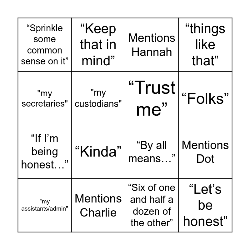 This bingo card has 16 words: Mentions Charlie, Mentions Dot, Mentions Hannah, “Sprinkle some common sense on it”, “If I’m being honest…”, “Keep that in mind”, “By all means…”, “Six of one and half a dozen of the other”, "my secretaries", "my custodians", "my assistants/admin", “things like that”, “Kinda”, “Folks”, “Trust me” and “Let’s be honest”.