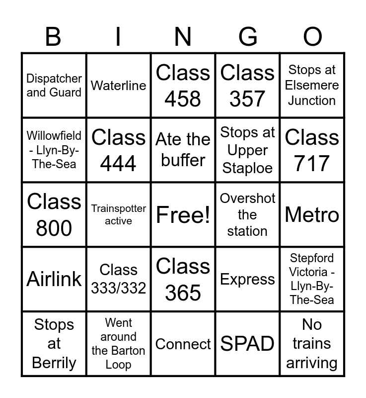 This bingo card has a free space and 24 words: Stops at Berrily, Class 333/332, Ate the buffer, SPAD, Stops at Elsemere Junction, Dispatcher and Guard, Waterline, Class 458, Overshot the station, Metro, Class 800, Class 444, Express, Stepford Victoria - Llyn-By-The-Sea, Willowfield - Llyn-By-The-Sea, Went around the Barton Loop, Connect, Class 357, Class 717, Airlink, Trainspotter active, Class 365, Stops at Upper Staploe and No trains arriving.
