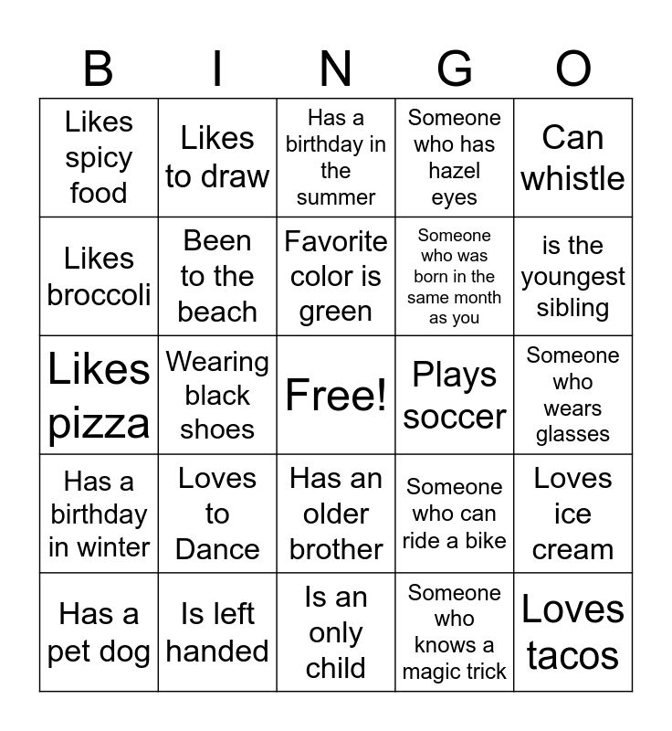 This bingo card has a free space and 24 words: Loves to Dance, Is left handed, Favorite color is green, Has a pet dog, Can whistle, Likes spicy food, Likes broccoli, Likes to draw, Plays soccer, Has an older brother, Someone who was born in the same month as you, Likes pizza, Someone who can ride a bike, Loves ice cream, Been to the beach, Someone who knows a magic trick, Someone who wears glasses, Has a birthday in the summer, is the youngest sibling, Wearing black shoes, Loves tacos, Has a birthday in winter, Someone who has hazel eyes and Is an only child.