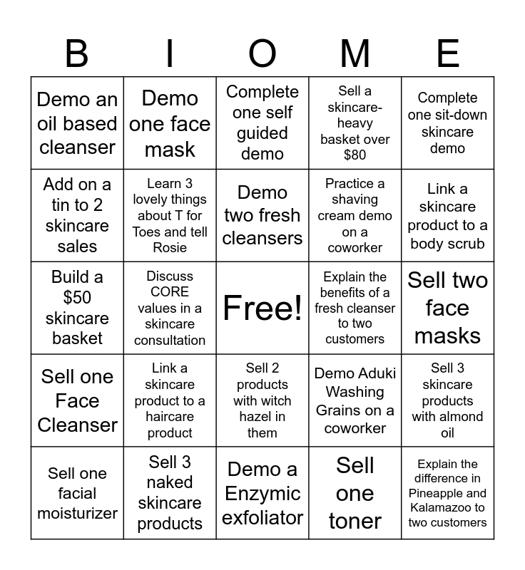 This bingo card has a free space and 24 words: Link a skincare product to a haircare product, Sell 3 naked skincare products, Demo two fresh cleansers, Sell one facial moisturizer, Complete one sit-down skincare demo, Demo an oil based cleanser, Add on a tin to 2 skincare sales, Demo one face mask, Explain the benefits of a fresh cleanser to two customers, Sell 2 products with witch hazel in them, Practice a shaving cream demo on a coworker, Build a $50 skincare basket, Demo Aduki Washing Grains on a coworker, Sell 3 skincare products with almond oil, Learn 3 lovely things about T for Toes and tell Rosie, Sell one toner, Sell two face masks, Complete one self guided demo, Link a skincare product to a body scrub, Discuss CORE values in a skincare consultation, Explain the difference in Pineapple and Kalamazoo to two customers, Sell one Face Cleanser, Sell a skincare-heavy basket over $80 and Demo a Enzymic exfoliator.