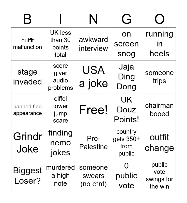 This bingo card has a free space and 24 words: finding nemo jokes, murdered a high note, USA a joke, Biggest Loser?, running in heels, outfit malfunction, stage invaded, UK less than 30 points total, UK Douz Points!, Pro-Palestine, Jaja Ding Dong, banned flag appearance, country gets 350+ from public, outfit change, score giver audio problems, 0 public vote, chairman booed, awkward interview, someone trips, eiffel tower jump scare, public vote swings for the win, Grindr Joke, on screen snog and someone swears (no c*nt).