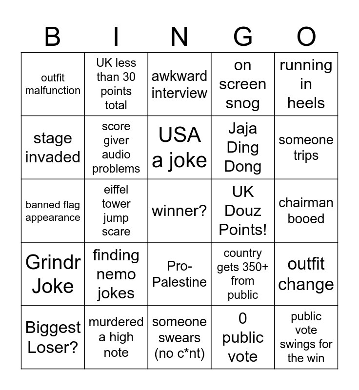 This bingo card has a free space and 24 words: finding nemo jokes, murdered a high note, USA a joke, Biggest Loser?, running in heels, outfit malfunction, stage invaded, UK less than 30 points total, UK Douz Points!, Pro-Palestine, Jaja Ding Dong, banned flag appearance, country gets 350+ from public, outfit change, score giver audio problems, 0 public vote, chairman booed, awkward interview, someone trips, eiffel tower jump scare, public vote swings for the win, Grindr Joke, on screen snog and someone swears (no c*nt).