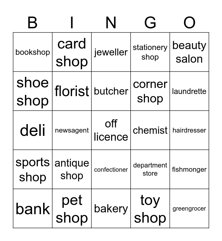 This bingo card has 25 words: antique shop, bakery, butcher, bank, beauty salon, bookshop, shoe shop, card shop, chemist, confectioner, corner shop, deli, department store, fishmonger, florist, greengrocer, hairdresser, jeweller, laundrette, newsagent, off licence, pet shop, sports shop, stationery shop and toy shop.
