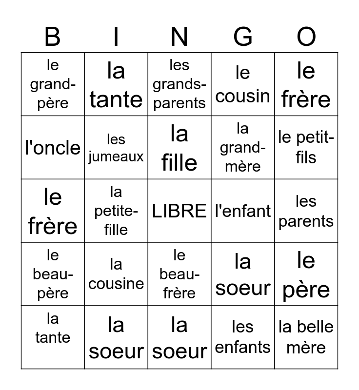 This bingo card has a free space and 24 words: la cousine, la soeur, la fille, la tante, le frère, le grand-père, l'oncle, la tante, l'enfant, le beau-frère, la grand-mère, le frère, la soeur, le père, les jumeaux, les enfants, les parents, les grands-parents, le petit- fils, la petite-fille, la belle mère, le beau-père, le cousin and la soeur.