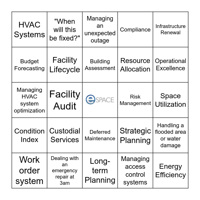 This bingo card has a free space and 39 words: Preventive Maintenance, Asset Management, Capital Planning, Facility Lifecycle, Work order system, Deferred Maintenance, Building Assessment, Sustainability, Infrastructure Renewal, Condition Index, Facility Audit, Compliance, Energy Efficiency, Space Utilization, Risk Management, Custodial Services, Groundskeeping, HVAC Systems, Safety Protocols, Strategic Planning, Budget Forecasting, Long-term Planning, Resource Allocation, Operational Excellence, Keycard not working, Mysterious bad smell, "The bathroom is out of soap", Emergency exit blocked, "Why is the power out?", "When will this be fixed?", Managing space utilization data, Using AI to optimize systems, Managing an unexpected outage, Dealing with an emergency repair at 3am, Managing access control systems, Updating your emergency preparedness plan, Handling a flooded area or water damage, Managing HVAC system optimization and Overseeing a large-scale renovation.