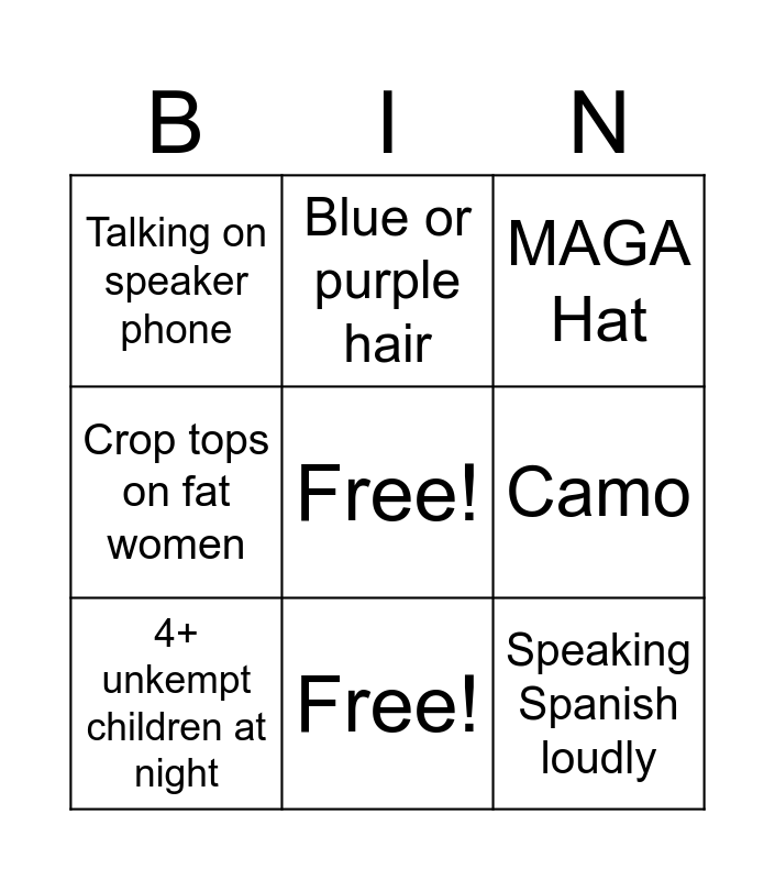 This bingo card has a free space and 8 words: Camo, MAGA Hat, Blue or purple hair, 4+ unkempt children at night, Talking on speaker phone, Speaking Spanish loudly, Crop tops on fat women and Free!.