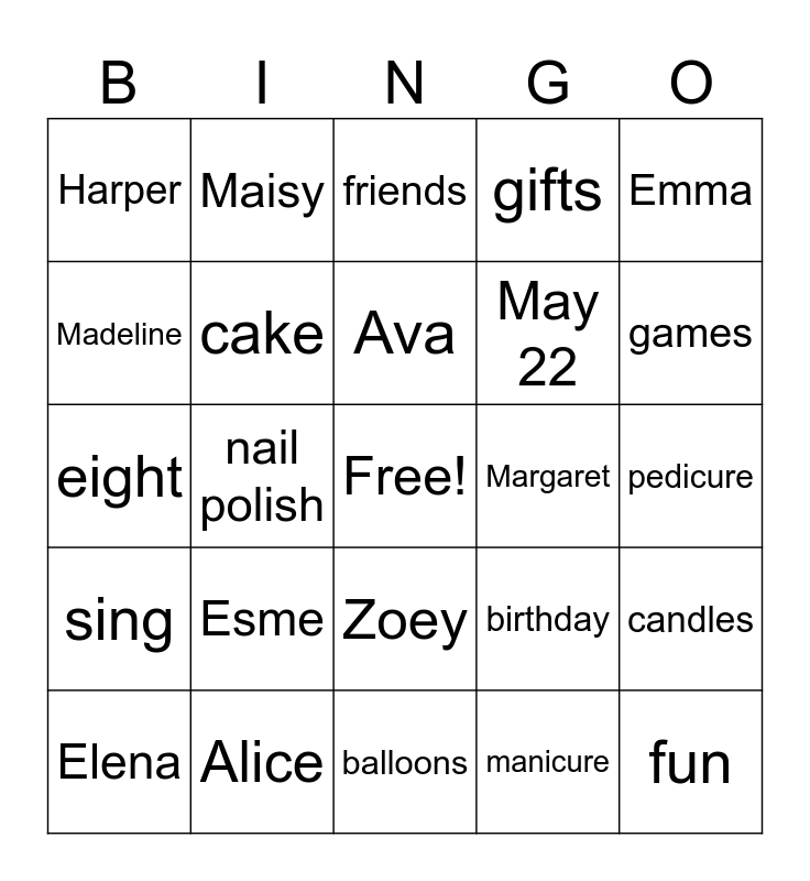 This bingo card has a free space and 24 words: Esme, Alice, Ava, Elena, Emma, Harper, Madeline, Maisy, Margaret, Zoey, May 22, eight, birthday, candles, cake, manicure, pedicure, friends, games, nail polish, fun, sing, gifts and balloons.