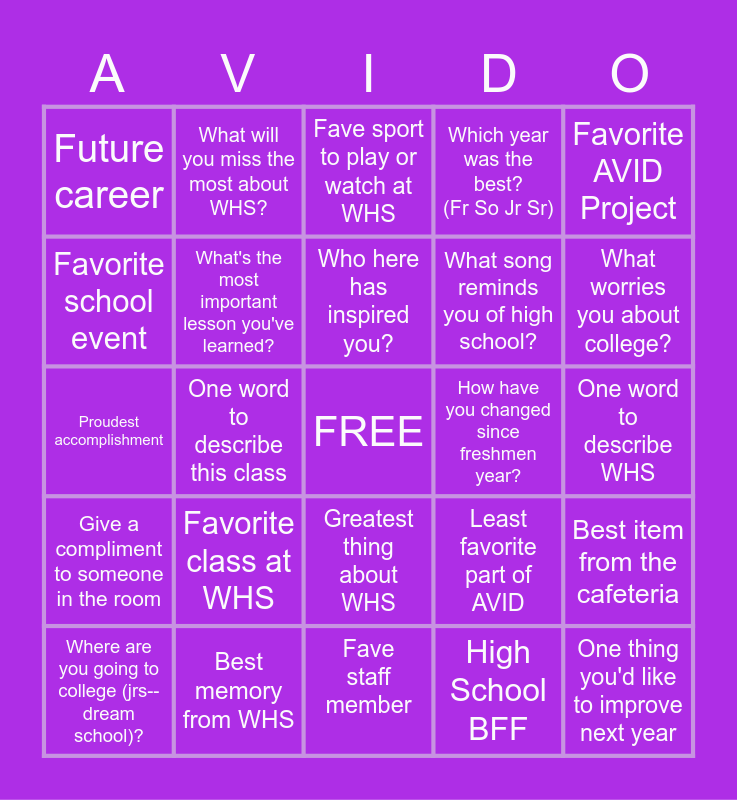 This bingo card has a free space and 24 words: Favorite class at WHS, Best memory from WHS, Who here has inspired you?, Where are you going to college (jrs--dream school)?, Favorite AVID Project, Future career, Favorite school event, What will you miss the most about WHS?, How have you changed since freshmen year?, Greatest thing about WHS, What song reminds you of high school?, Proudest accomplishment, Least favorite part of AVID, Best item from the cafeteria, What's the most important lesson you've learned?, High School BFF, One word to describe WHS, Fave sport to play or watch at WHS, What worries you about college?, One word to describe this class, One thing you'd like to improve next year, Give a compliment to someone in the room, Which year was the best? (Fr So Jr Sr) and Fave staff member.