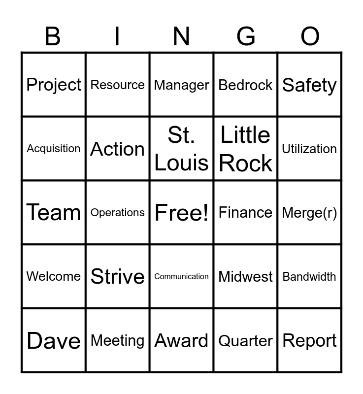 This bingo card has a free space and 24 words: Strive, Meeting, St. Louis, Dave, Safety, Project, Acquisition, Resource, Finance, Communication, Little Rock, Team, Midwest, Bandwidth, Action, Quarter, Merge(r), Manager, Utilization, Operations, Report, Welcome, Bedrock and Award.