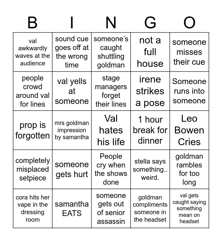 This bingo card has a free space and 26 words: People cry when the shows done, goldman compliments someone in the headset, stage managers forget their lines, samantha EATS, someone misses their cue, val awkwardly waves at the audience, people crowd around val for lines, sound cue goes off at the wrong time, Leo Bowen Cries, stella says something.. weird., irene strikes a pose, prop is forgotten, goldman rambles for too long, cora hits her vape in the dressing room, mrs goldman impression by samantha, val’s feet start hurting, not a full house, completely misplaced setpiece, someone’s caught shuttling goldman, val gets caught saying something mean on headset, Someone runs into someone, someone gets out of senior assassin, 1 hour break for dinner, someone gets hurt, val yells at someone and Val yells at leo bowen.
