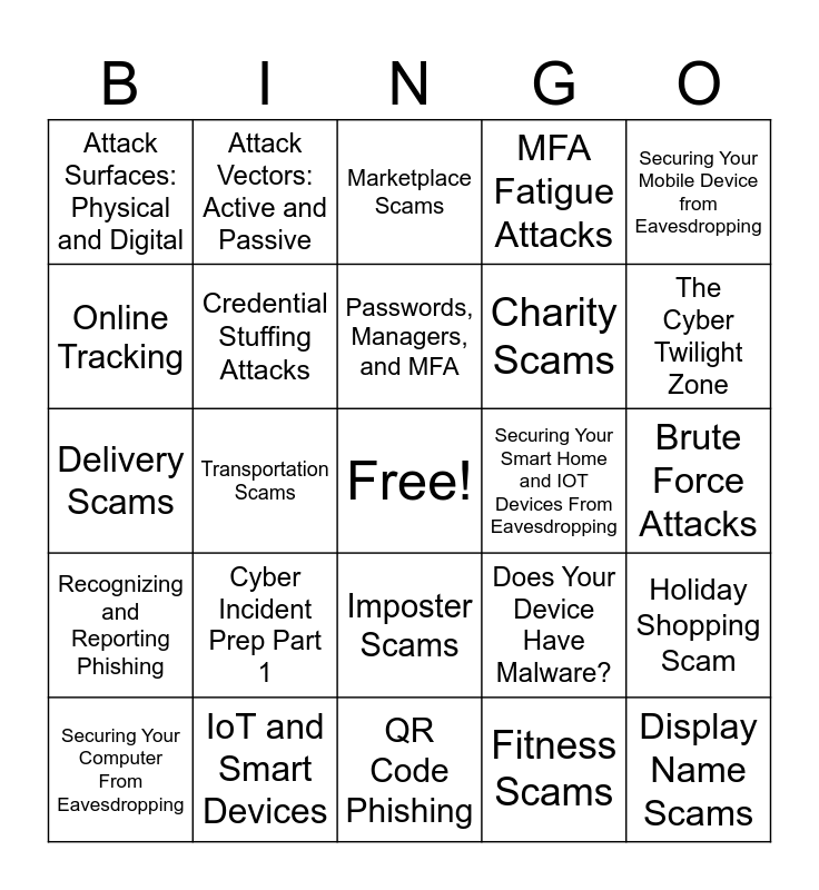 This bingo card has a free space and 26 words: How to Keep Your Bluetooth Happy, Cyber Incident Prep Part 1, QR Code Phishing, Fitness Scams, The Cyber Twilight Zone, Attack Surfaces: Physical and Digital, Attack Vectors: Active and Passive, Marketplace Scams, Charity Scams, Holiday Shopping Scam, Delivery Scams, Transportation Scams, Does Your Device Have Malware?, Display Name Scams, Recognizing and Reporting Phishing, Updating Pro Tips, Passwords, Managers, and MFA, Securing Your Smart Home and IOT Devices From Eavesdropping, Securing Your Mobile Device from Eavesdropping, Securing Your Computer From Eavesdropping, Credential Stuffing Attacks, Imposter Scams, MFA Fatigue Attacks, Brute Force Attacks, Online Tracking and IoT and Smart Devices.