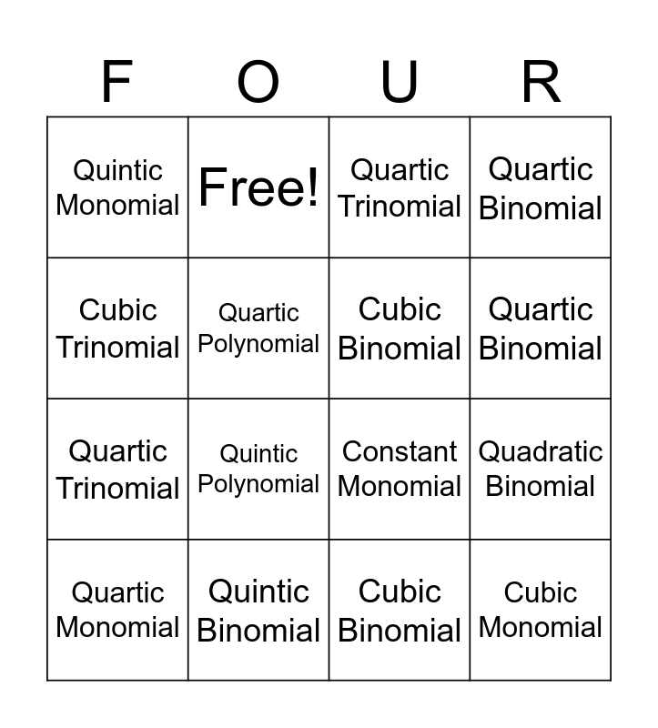 ⚠ This card has duplicate items: Constant Monomial (2), Quadratic Binomial (2), Cubic Monomial (2), Cubic Binomial (2), Cubic Trinomial (2), Quartic Monomial (2), Quartic Binomial (2), Quartic Trinomial (2), Quartic Polynomial (2), Quintic Monomial (2), Quintic Binomial (2), Quintic Trinomial (2), Quintic Polynomial (2)