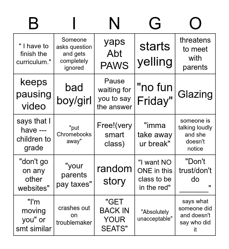 This bingo card has a free space and 24 words: "your parents pay taxes", crashes out on troublemaker, Pause waiting for you to say the answer, "I'm moving you" or smt similar, threatens to meet with parents, " I have to finish the curriculum.", keeps pausing video, Someone asks question and gets completely ignored, "imma take away ur break", random story, "no fun Friday", says that I have --- children to grade, "I want NO ONE in this class to be in the red", "Don't trust/don't do _______", bad boy/girl, "Absolutely unacceptable", someone is talking loudly and she doesn't notice, yaps Abt PAWS, Glazing, "put Chromebooks away", says what someone did and doesn't say who did it, "don't go on any other websites", starts yelling and "GET BACK IN YOUR SEATS".