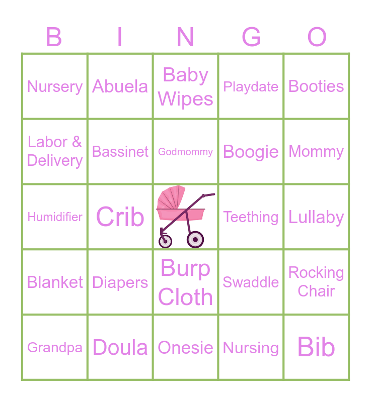 This bingo card has 1 images, a free space and 25 words: Diapers, Onesie, Nursing, Mommy, Nursery, Abuela, Baby Wipes, Boogie, Rocking Chair, Humidifier, Crib, Swaddle, Bib, Blanket, Rest, Godmommy, Teething, Booties, Grandpa, Bassinet, Burp Cloth, Playdate, Lullaby, Labor & Delivery and Doula.