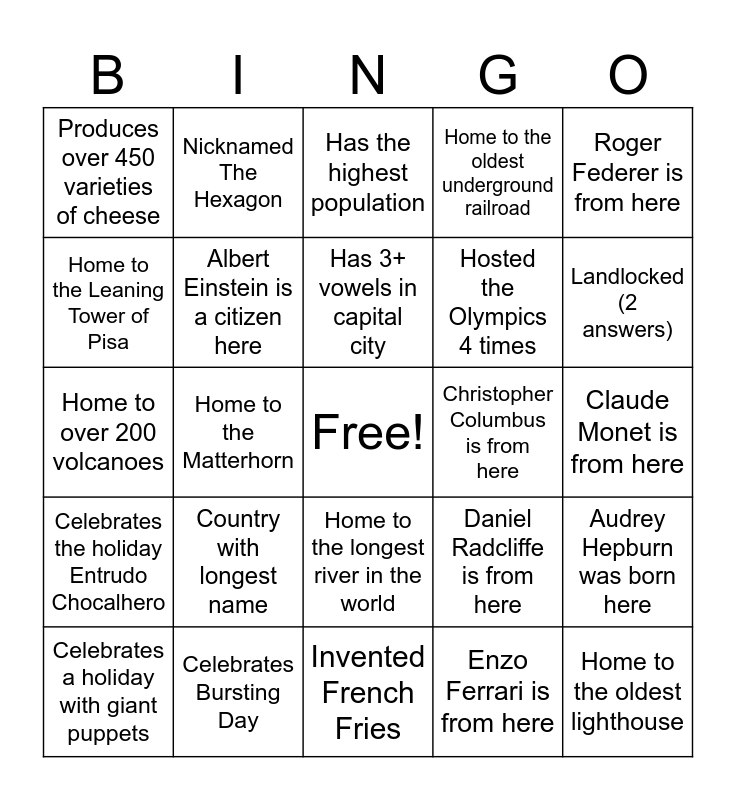 This bingo card has a free space and 24 words: Country with longest name, Celebrates Bursting Day, Has 3+ vowels in capital city, Celebrates a holiday with giant puppets, Roger Federer is from here, Produces over 450 varieties of cheese, Home to the Leaning Tower of Pisa, Nicknamed The Hexagon, Christopher Columbus is from here, Home to the longest river in the world, Hosted the Olympics 4 times, Home to over 200 volcanoes, Daniel Radcliffe is from here, Audrey Hepburn was born here, Albert Einstein is a citizen here, Enzo Ferrari is from here, Claude Monet is from here, Has the highest population, Landlocked (2 answers), Home to the Matterhorn, Home to the oldest lighthouse, Celebrates the holiday Entrudo Chocalhero, Home to the oldest underground railroad and Invented French Fries.