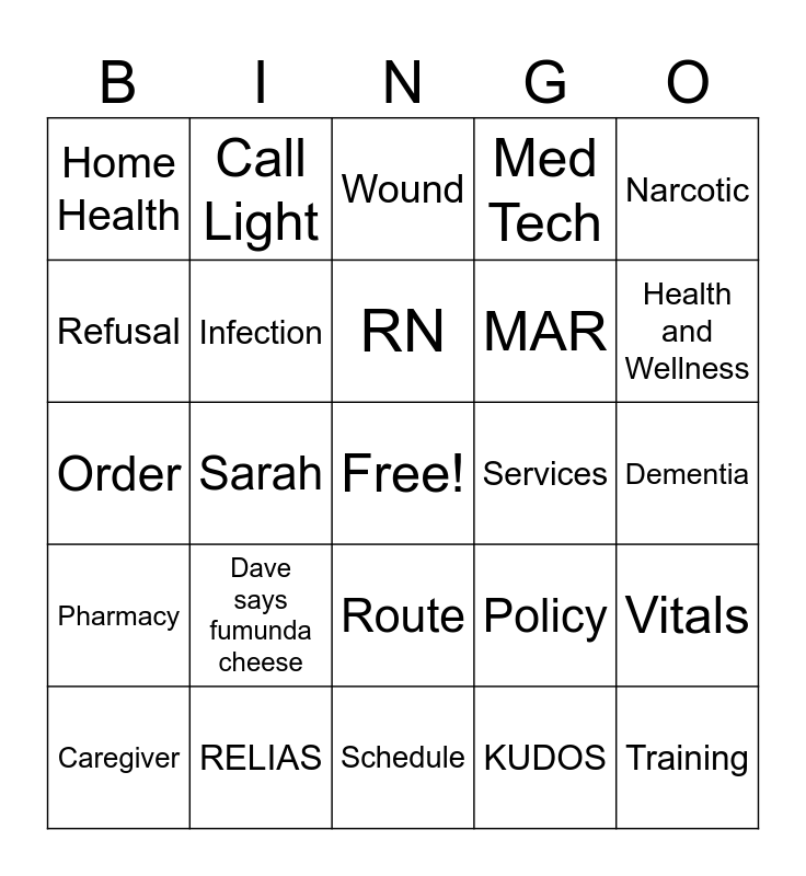 This bingo card has a free space and 29 words: Caregiver, Med Error, Sarah, IR, Home Health, Wound, Infection, Dave says fumunda cheese, Services, RELIAS, Dementia, Training, Schedule, KUDOS, Health and Wellness, Documentation, Route, Pharmacy, Narcotic, Order, Policy, SLING, MAR, Refusal, Med Tech, Call Light, Vitals, RN and Hospice.