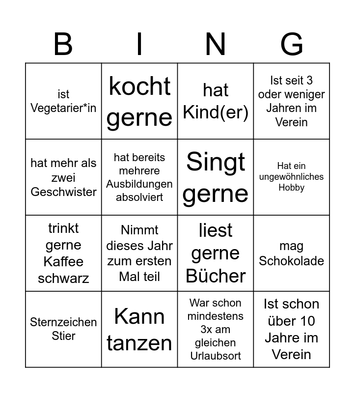 This bingo card has 24 words: hat ein Haustier, ist Frühaufsteher*in, Hat ein ungewöhnliches Hobby, kann die Zunge nicht rollen, hat mehr als zwei Geschwister, ist Vegetarier*in, hat bereits mehrere Ausbildungen absolviert, kocht gerne, Kann tanzen, hat keine Geschwister, trinkt gerne Kaffee schwarz, liest gerne Bücher, hat einen grünen Daumen, spielt/e ein Instrument, Singt gerne, ist Links-händer*in, War schon mindestens 3x am gleichen Urlaubsort, hat Kind(er), Nimmt dieses Jahr zum ersten Mal teil, mag Schokolade, Sternzeichen Stier, Ist schon über 10 Jahre im Verein, Ist seit 3 oder weniger Jahren im Verein and Kann Stricken/ Häkeln.
