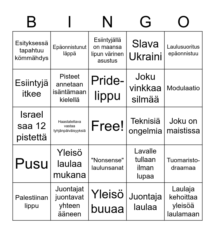 This bingo card has a free space and 25 words: Yleisö laulaa mukana, Yleisö buuaa, Pride-lippu, Palestiinan lippu, Laulusuoritus epäonnistuu, Esityksessä tapahtuu kömmähdys, Esiintyjä itkee, Epäonnistunut läppä, Teknisiä ongelmia, "Nonsense" laulunsanat, Joku vinkkaa silmää, Israel saa 12 pistettä, Lavalle tullaan ilman lupaa, Tuomaristo- draamaa, Pisteet annetaan isäntämaan kielellä, Esiintyjä huutaa "EUROPE" kesken esityksen, Joku on maistissa, Esiintyjällä on maansa lipun värinen asustus, Modulaatio, Haastateltava vastaa tyhjänpäiväisyyksiä, Laulaja kehoittaa yleisöä laulamaan, Juontajat juontavat yhteen ääneen, Pusu, Slava Ukraini and Juontaja laulaa.
