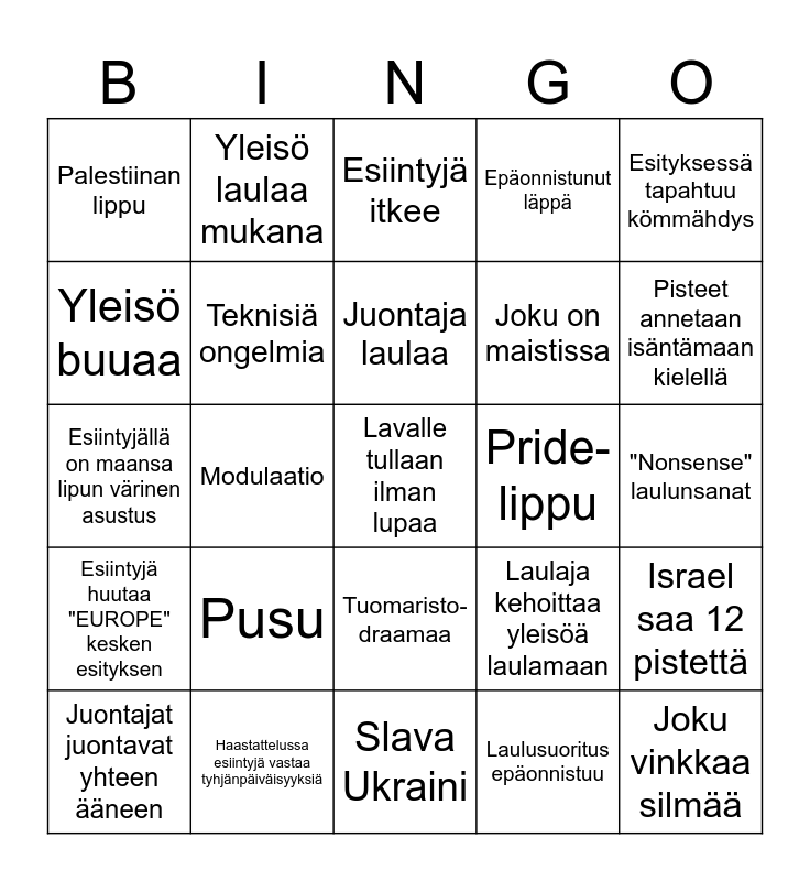 This bingo card has 25 words: Pusu, Slava Ukraini, Juontaja laulaa, Juontajat juontavat yhteen ääneen, Esityksessä tapahtuu kömmähdys, Palestiinan lippu, Yleisö buuaa, Yleisö laulaa mukana, Pride-lippu, Tuomaristo- draamaa, Joku on maistissa, Esiintyjällä on maansa lipun värinen asustus, Laulaja kehoittaa yleisöä laulamaan, Israel saa 12 pistettä, Teknisiä ongelmia, Joku vinkkaa silmää, "Nonsense" laulunsanat, Esiintyjä itkee, Pisteet annetaan isäntämaan kielellä, Modulaatio, Lavalle tullaan ilman lupaa, Haastattelussa esiintyjä vastaa tyhjänpäiväisyyksiä, Esiintyjä huutaa "EUROPE" kesken esityksen, Epäonnistunut läppä and Laulusuoritus epäonnistuu.