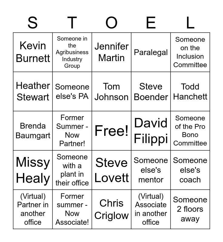 This bingo card has a free space and 24 words: Someone with a plant in their office, Former summer - Now Associate!, Tom Johnson, (Virtual) Partner in another office, Someone on the Inclusion Committee, Kevin Burnett, Heather Stewart, Someone in the Agribusiness Industry Group, David Filippi, Steve Lovett, Steve Boender, Brenda Baumgart, Someone else's mentor, Someone else's coach, Someone else's PA, (Virtual) Associate in another office, Someone of the Pro Bono Committee, Jennifer Martin, Todd Hanchett, Former Summer - Now Partner!, Someone 2 floors away, Missy Healy, Paralegal and Chris Criglow.