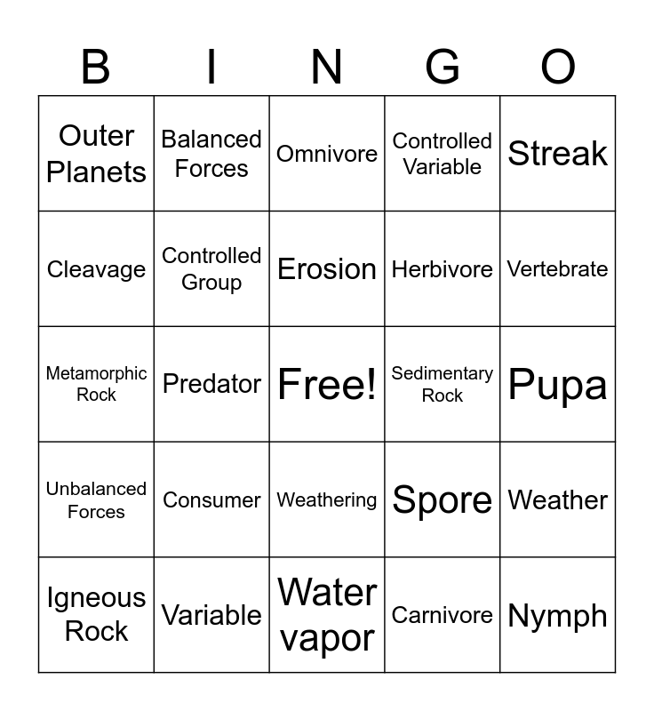 This bingo card has a free space and 28 words: Weather, Climate, Herbivore, Carnivore, Cleavage, Omnivore, Balanced Forces, Unbalanced Forces, Sedimentary Rock, Igneous Rock, Metamorphic Rock, Controlled Variable, Variable, Water vapor, Vertebrate, Invertebrate, Consumer, Controlled Group, Erosion, Weathering, Outer Planets, Luster, Nymph, Predator, Pupa, Spore, Streak and Hardness.