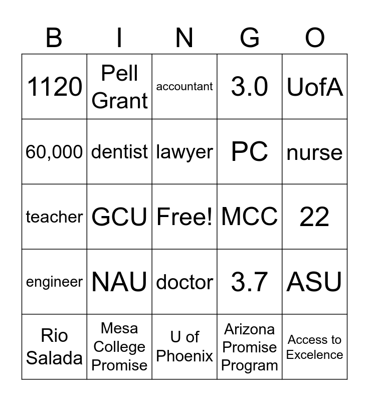 This bingo card has a free space and 24 words: NAU, Mesa College Promise, lawyer, Rio Salada, UofA, 1120, 60,000, Pell Grant, MCC, doctor, PC, teacher, 3.7, ASU, dentist, Arizona Promise Program, 22, accountant, nurse, GCU, Access to Excelence, engineer, 3.0 and U of Phoenix.